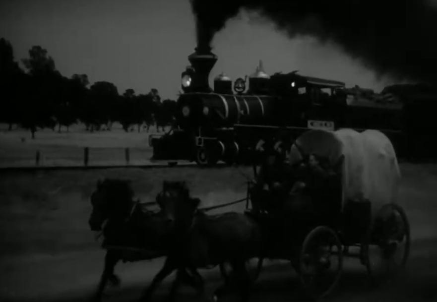 The O’Leary family, comprised of Patrick, Molly, and their children Jack, Dion1, and Bob, trundle their way to Chicago in a covered wagon. They marvel at a steam train that’s passing through the prairie. Egged on by his sons, Patrick attempts to race the train, but tragedy strikes when the horses break loose and drag him. Surrounded by his family, Patrick urges them to make something of themselves in Chicago, after which he succumbs to his injuries. He insists they bury him there, and that he’ll just have to wait for Chicago to come to him.