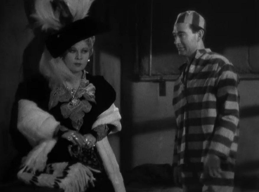 Ellen: I’d like to skip town before The Academy breaks out of prison! Truly what is even happening in this movie. The plot hangs together by a thread, and that thread is “Mae West is so sexy that any man with whom she comes in contact is instantly cooked.” I leaned on the Wikipedia summary much more than usual in writing Plots & Feelings, because certain plotlines jumped around so much it felt like they cut some explanatory lines, or maybe even whole scenes! That being said, I did have fun! Mae West’s delivery is absolutely wild and of a time, so between that highly inimitable patter and the relentless one-liners, I was smiling the whole time. Confused, but smiling!